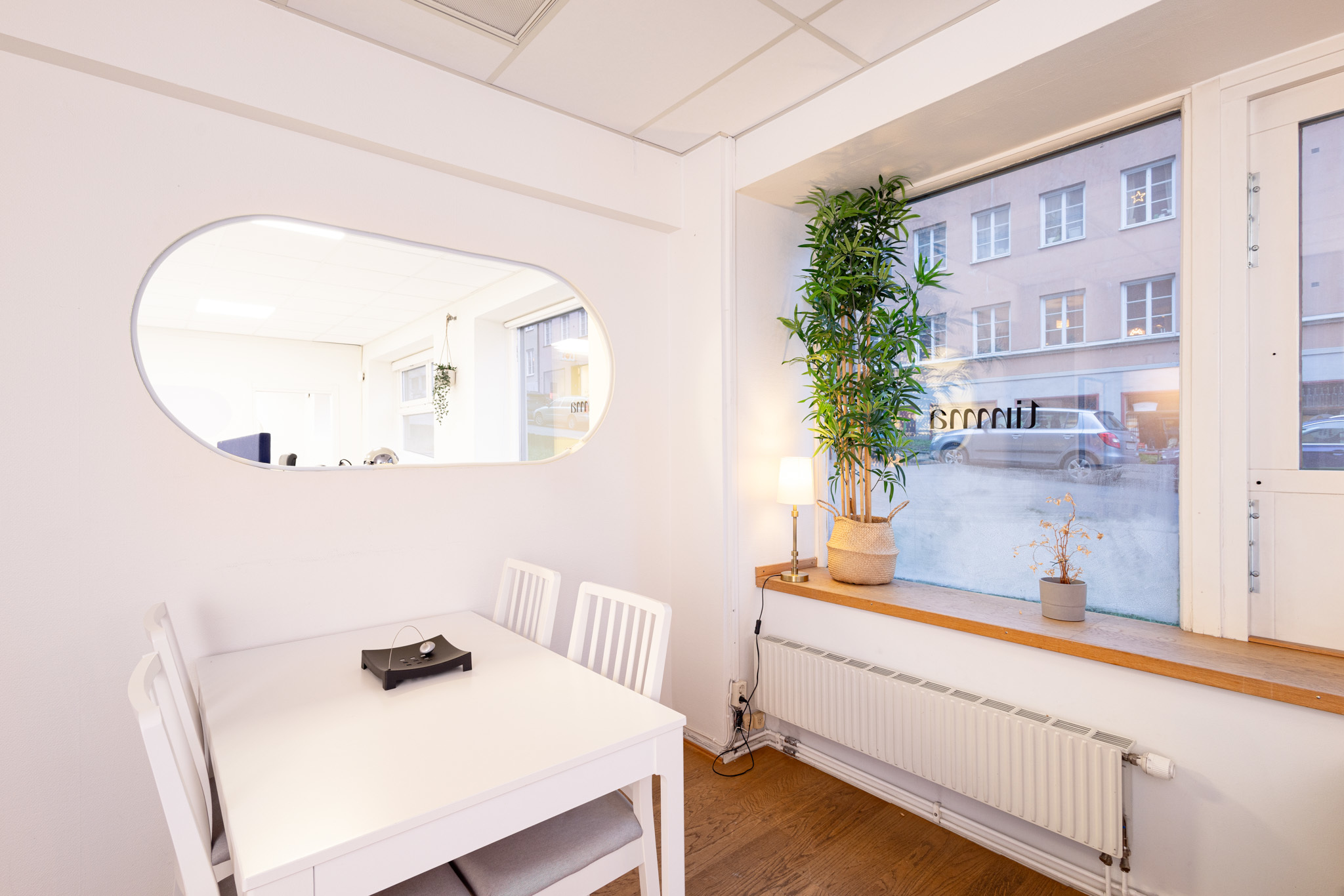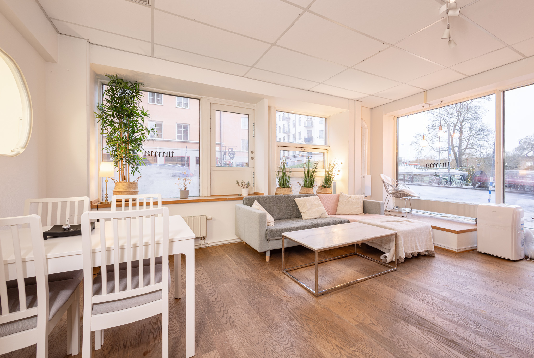 Lokalen präglas av stora fönster längs fasaden och ett generöst skyltfönster mot vattnet som ger en fantastisk utsikt och ett otroligt ljusinsläpp. Det är sällan man hittar en lokal med en sådan närhet till vattnet, här får hela området och strandlinjen ett eget uttryck i lokalen.