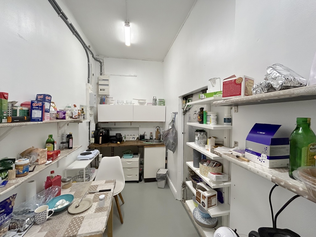 Lokalen har dessutom ett eget personalrum med pentry några trappteg upp, vilket ger en avskild och praktisk arbetsmiljö. Även wc finns. Som extra bonus finns källarutrymmen några trappor ned på cirka 60 kvm. Detta nyttjas i dag som lager.