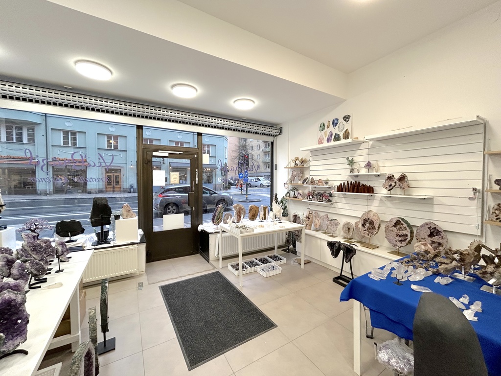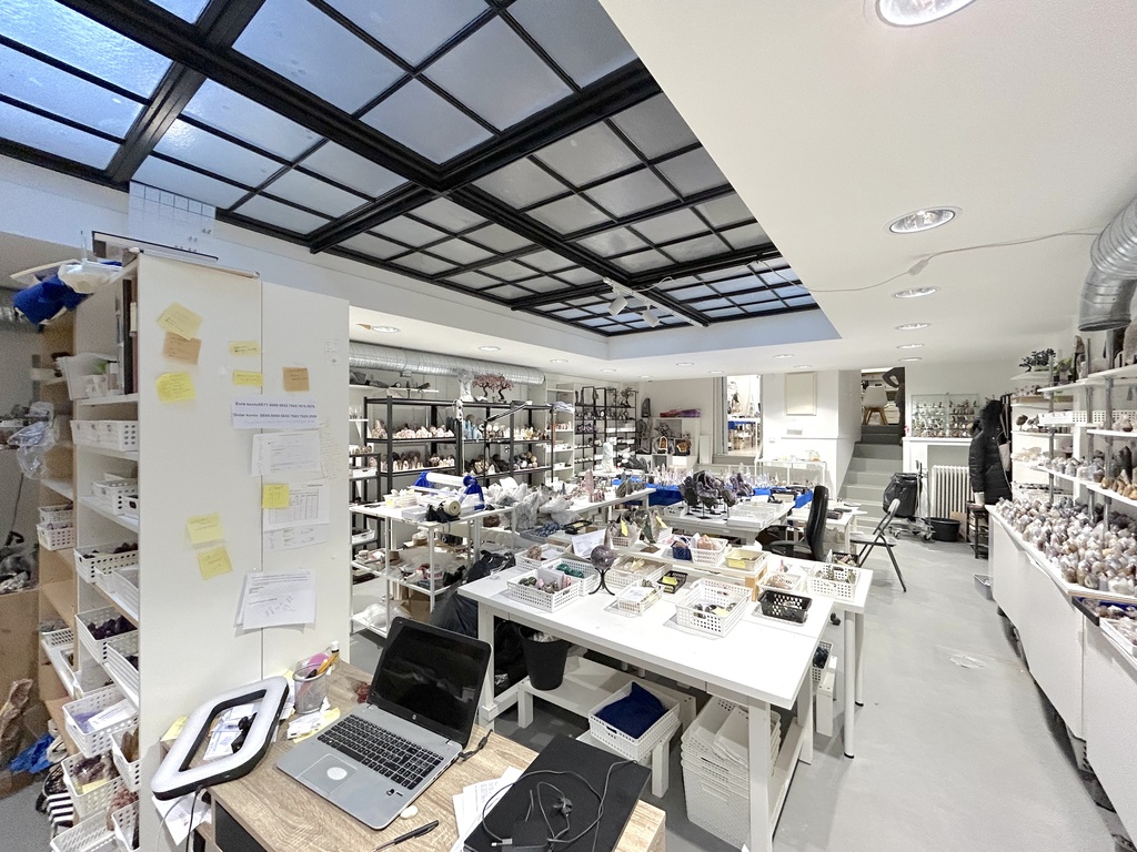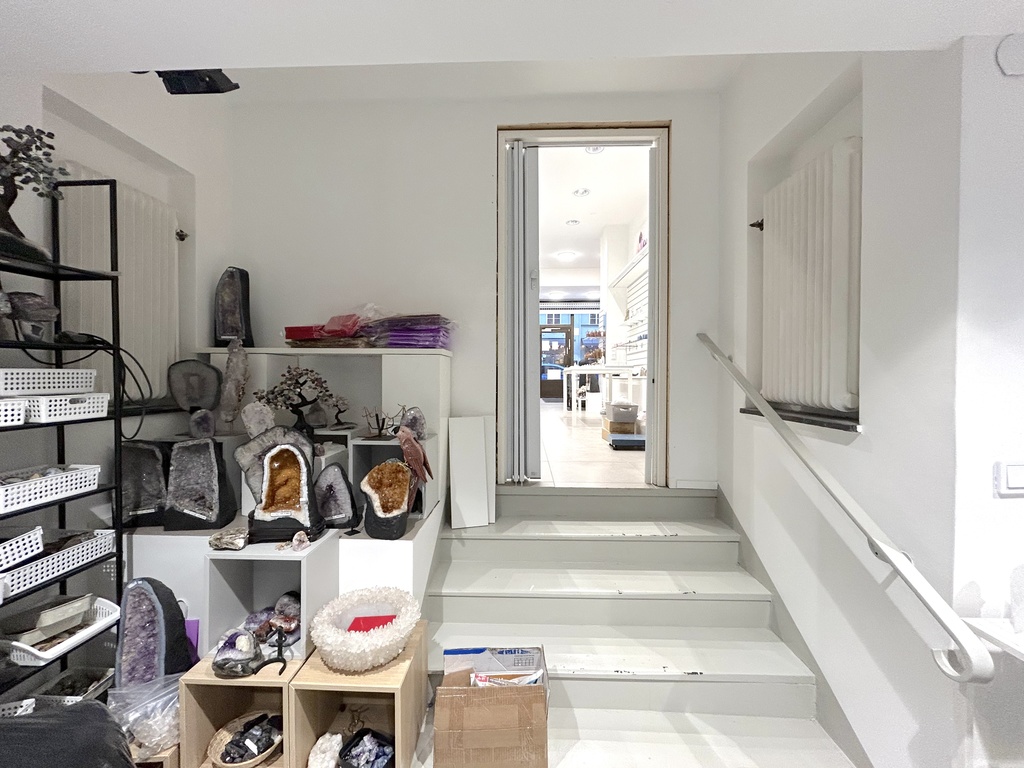 När man kliver in möts man av en öppen och inbjudande yta som med några trappsteg längre in leder till ett ännu större rum. Den nuvarande planlösningen med en vägg som delar rummet kan enkelt förändras till en mer enhetlig yta om man vill ha ett större öppet utrymme. Lokalen har även ett stort takfönster med frostat glas som släpper in ett mjukt ljus och förstärker känslan av rymd.