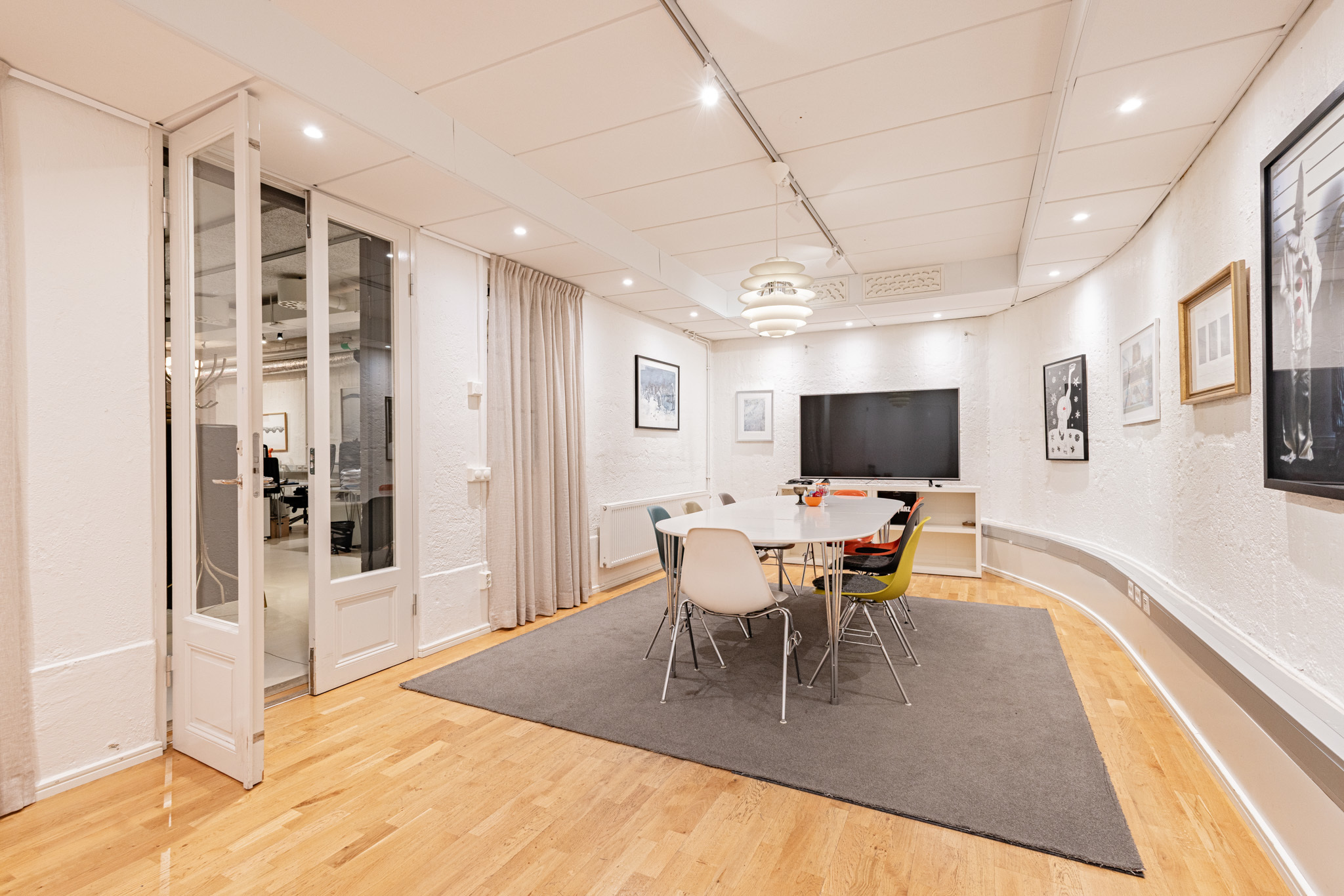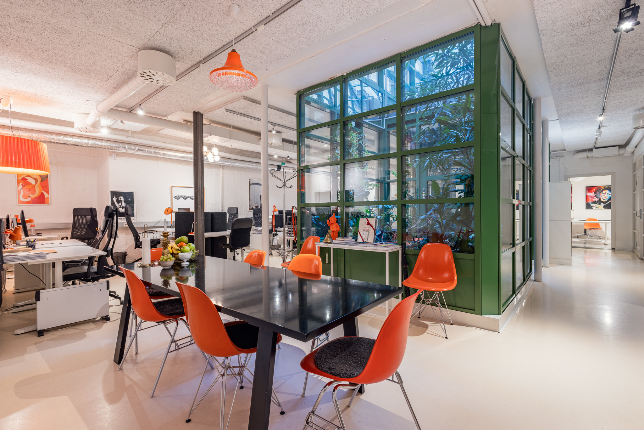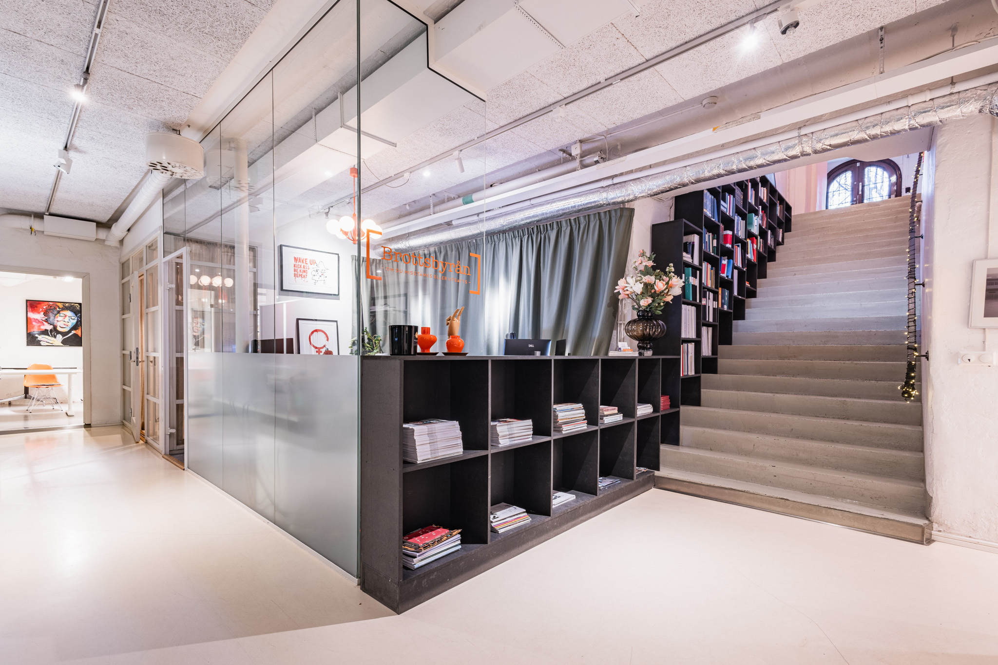 Lokalen en halv trappa ner utgör ett mycket representativt kontor med en genomtänkt planlösning som disponeras över öppna ytor i kombination med flera separata mötesrum för enskilt arbete eller möten. Två härliga ljusgårdar bidrar med generöst dagsljus och kan även nyttjas för möten eller rekreation, vilket skapar en trivsam och professionell arbetsmiljö. Lokalen är utrustad med två WC, fiberanslutning samt mekanisk ventilation.