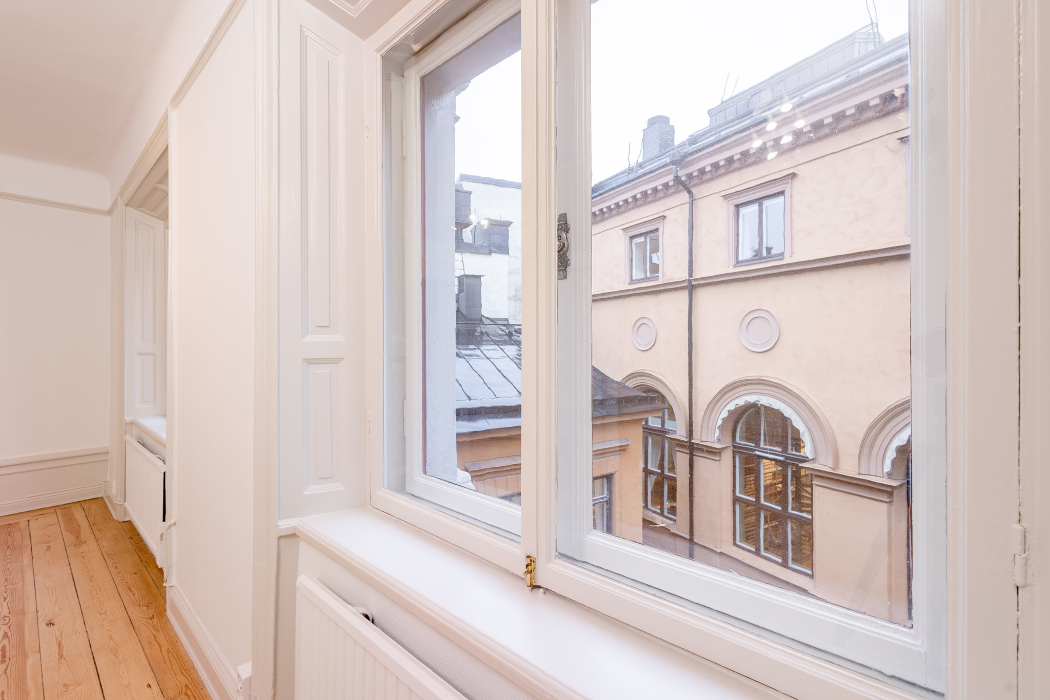 Lokalen är i ett gott renoverat skick med fina ytskikt och väl underhållna och tidstypiska trägolv!