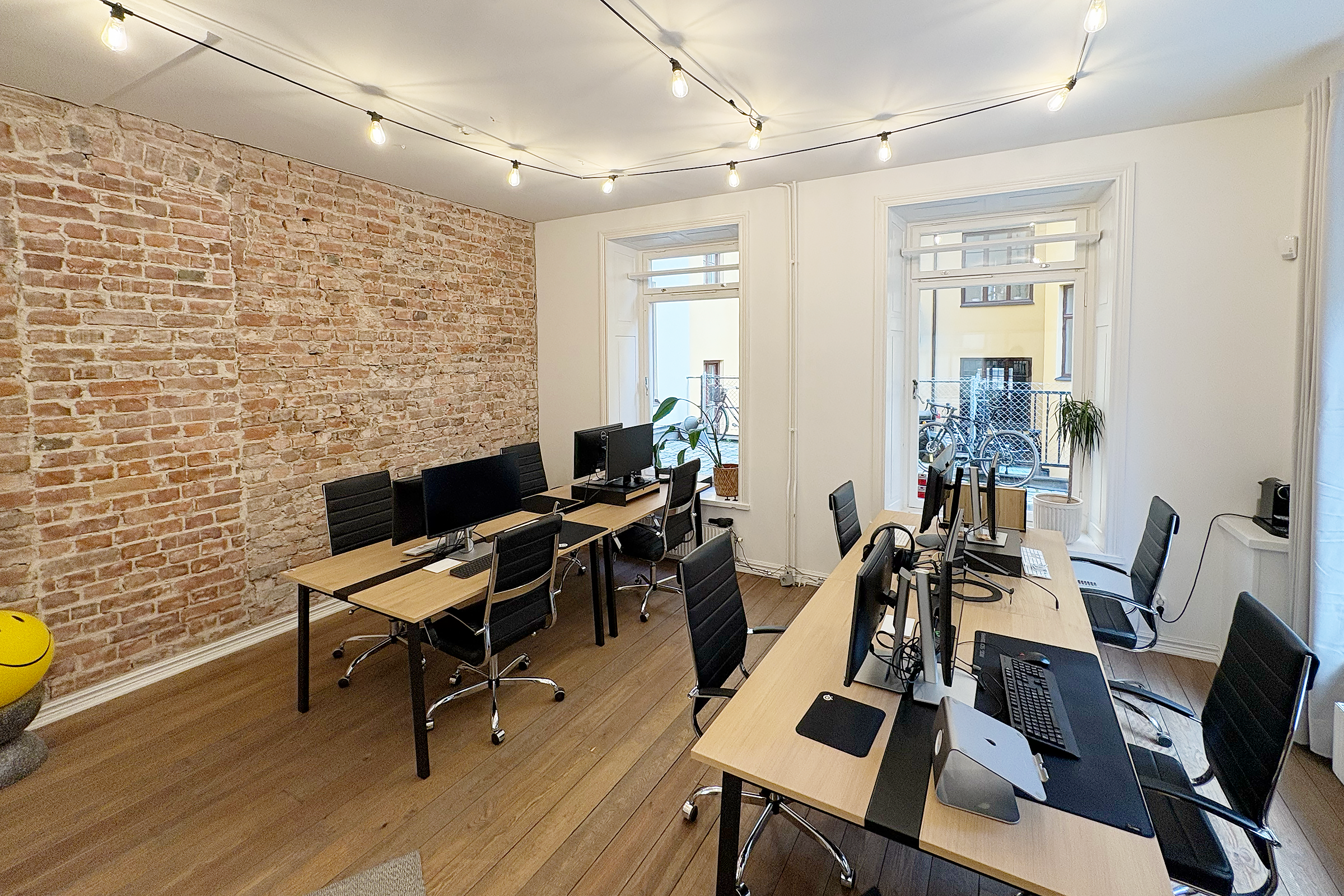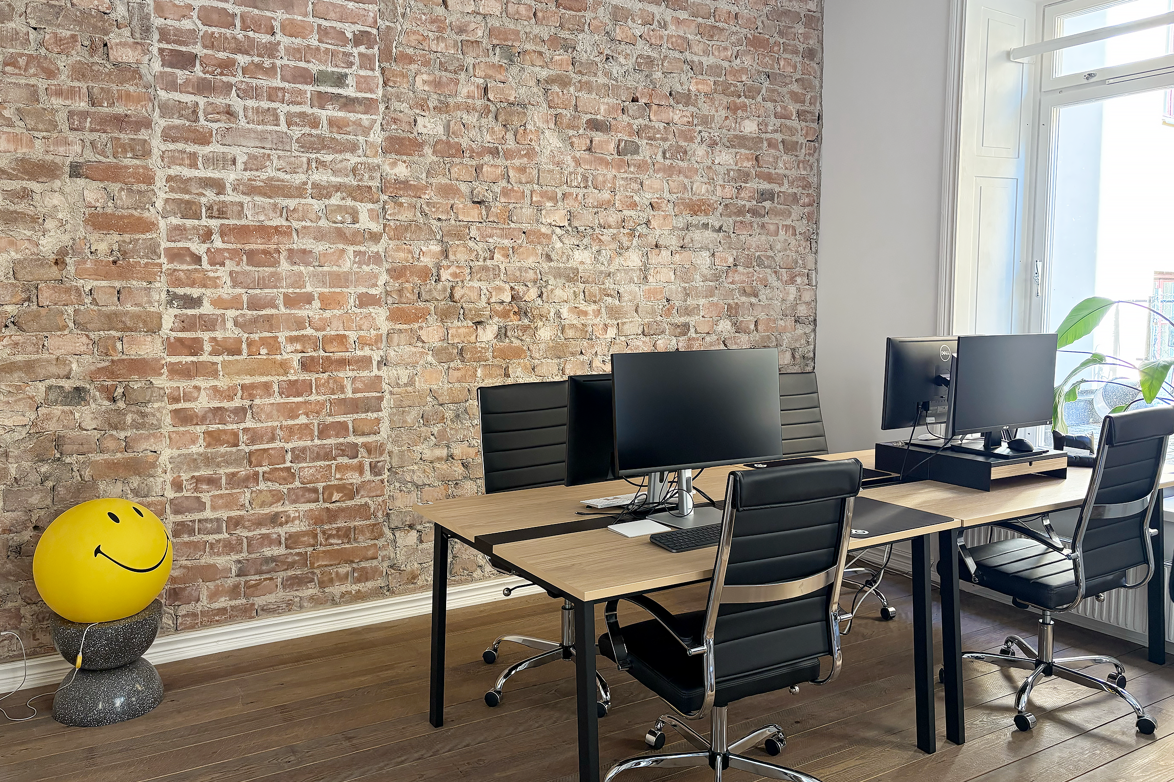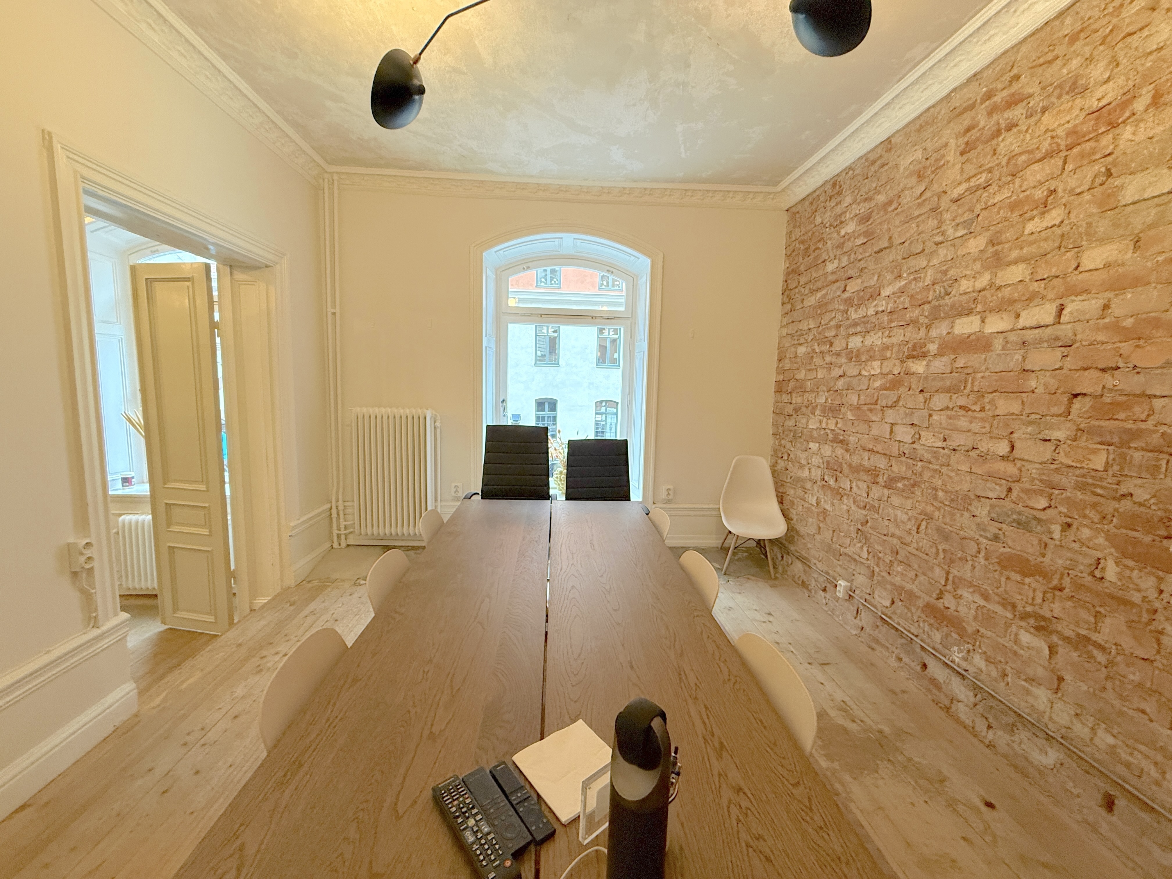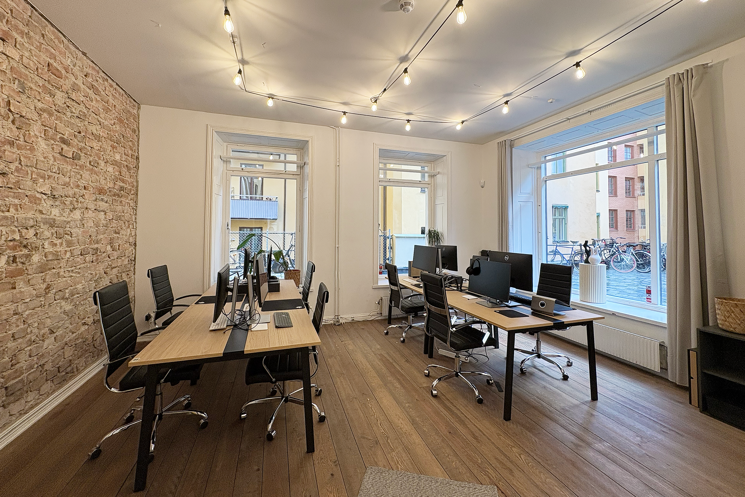 Lokalen har en rustik och karaktärsfull atmosfär med frilagda tegelväggar, trägolv med fin patina och en imponerande takhöjd som skapar rymd. Ytan är uppdelad i två delar, där den ena vetter mot en lugn innergård och den andra mot Tegnérgatans livfulla gatumiljö. Generöst ljusinsläpp från flera väderstreck bidrar till en behaglig arbetsmiljö.