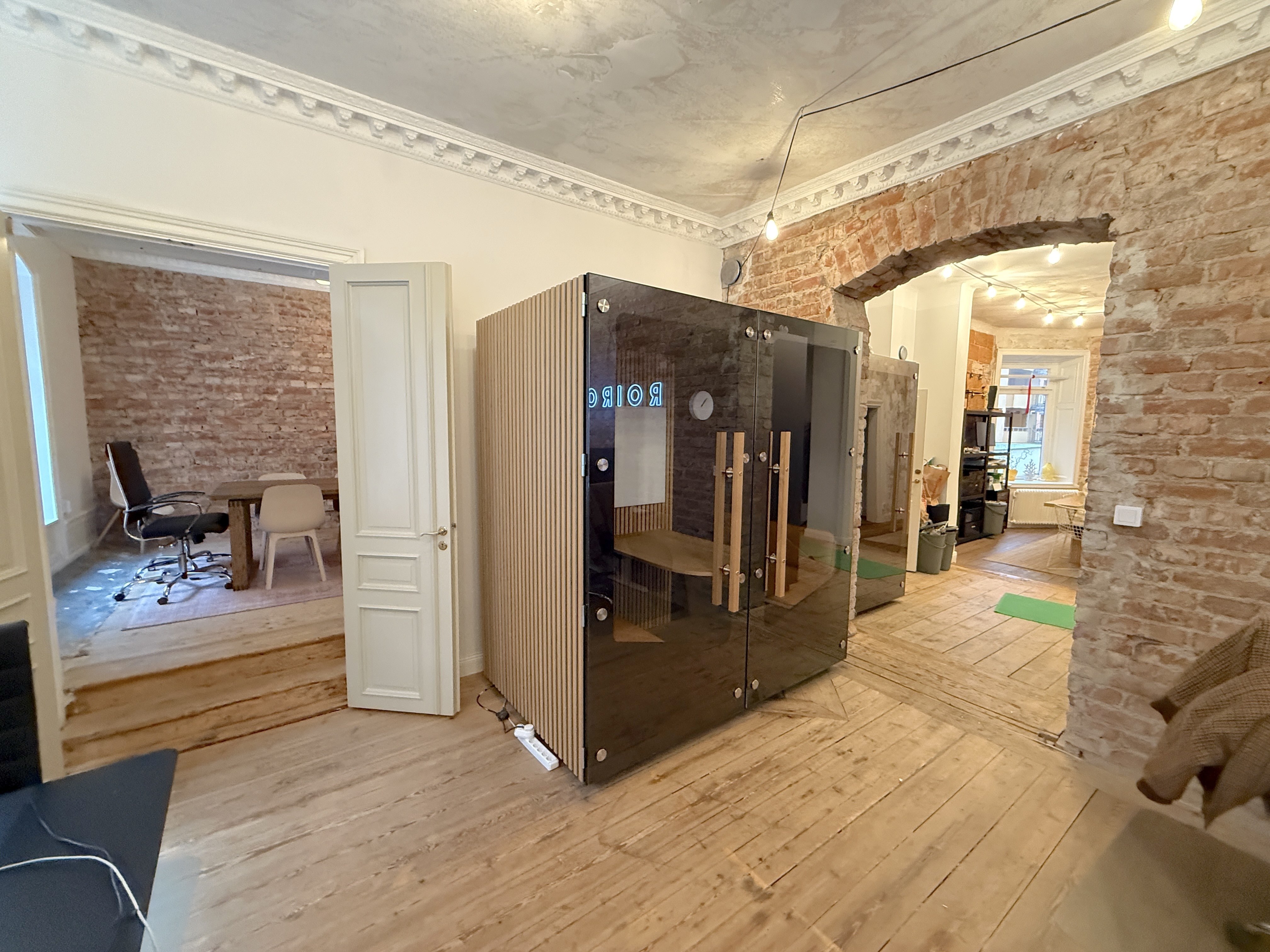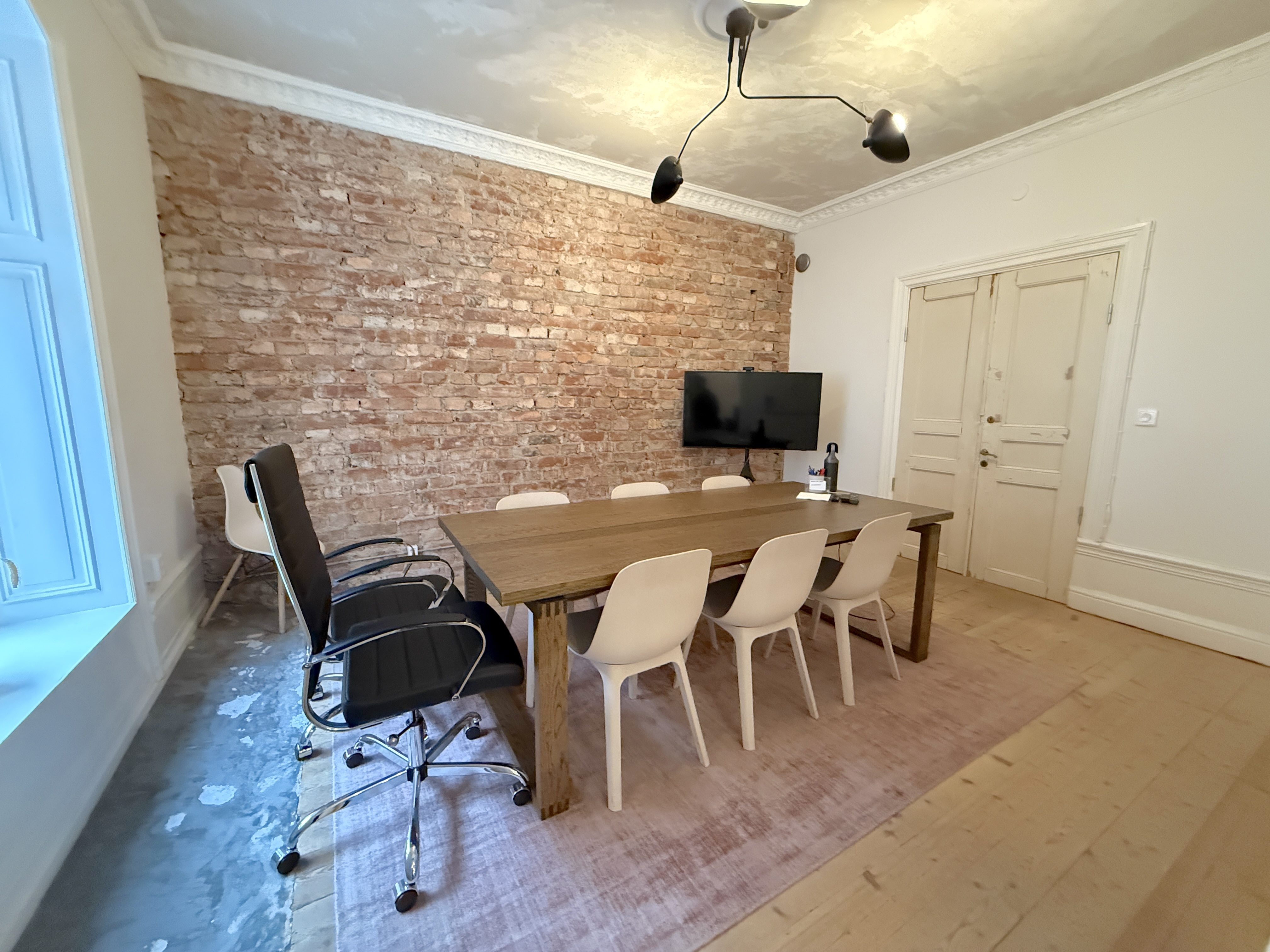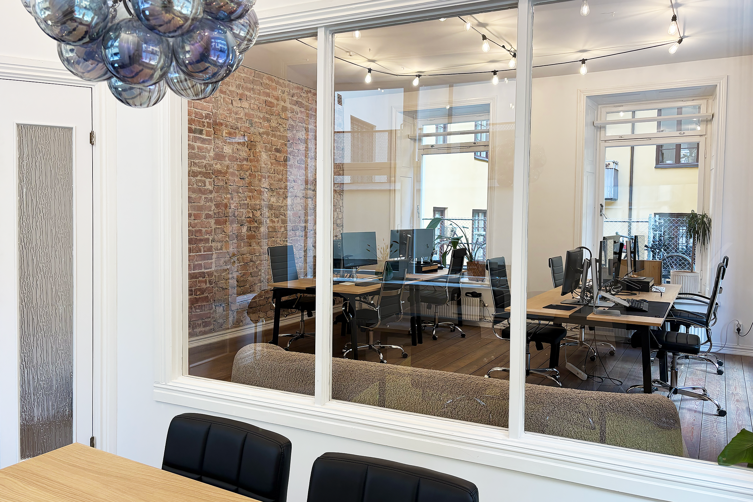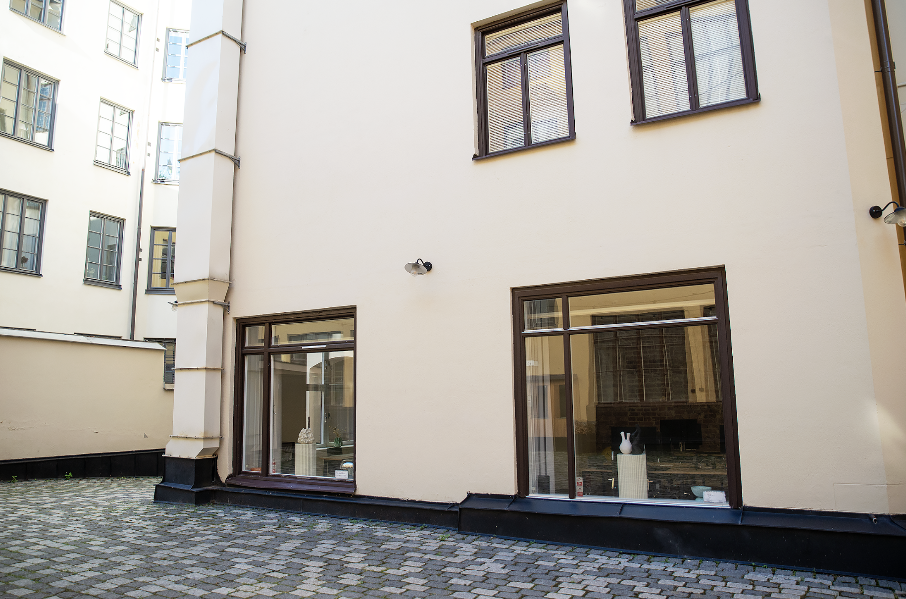 Lokalen har en rustik och karaktärsfull atmosfär med frilagda tegelväggar, trägolv med fin patina och en imponerande takhöjd som skapar rymd. Ytan är uppdelad i två delar, där den ena vetter mot en lugn innergård och den andra mot Tegnérgatans livfulla gatumiljö. Generöst ljusinsläpp från flera väderstreck bidrar till en behaglig arbetsmiljö.
