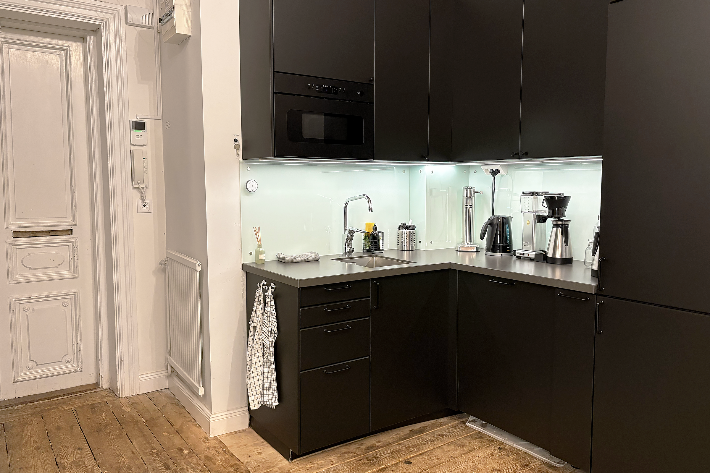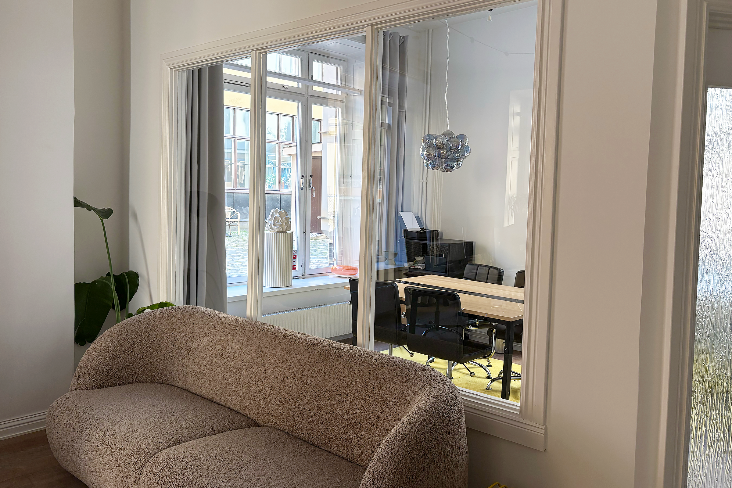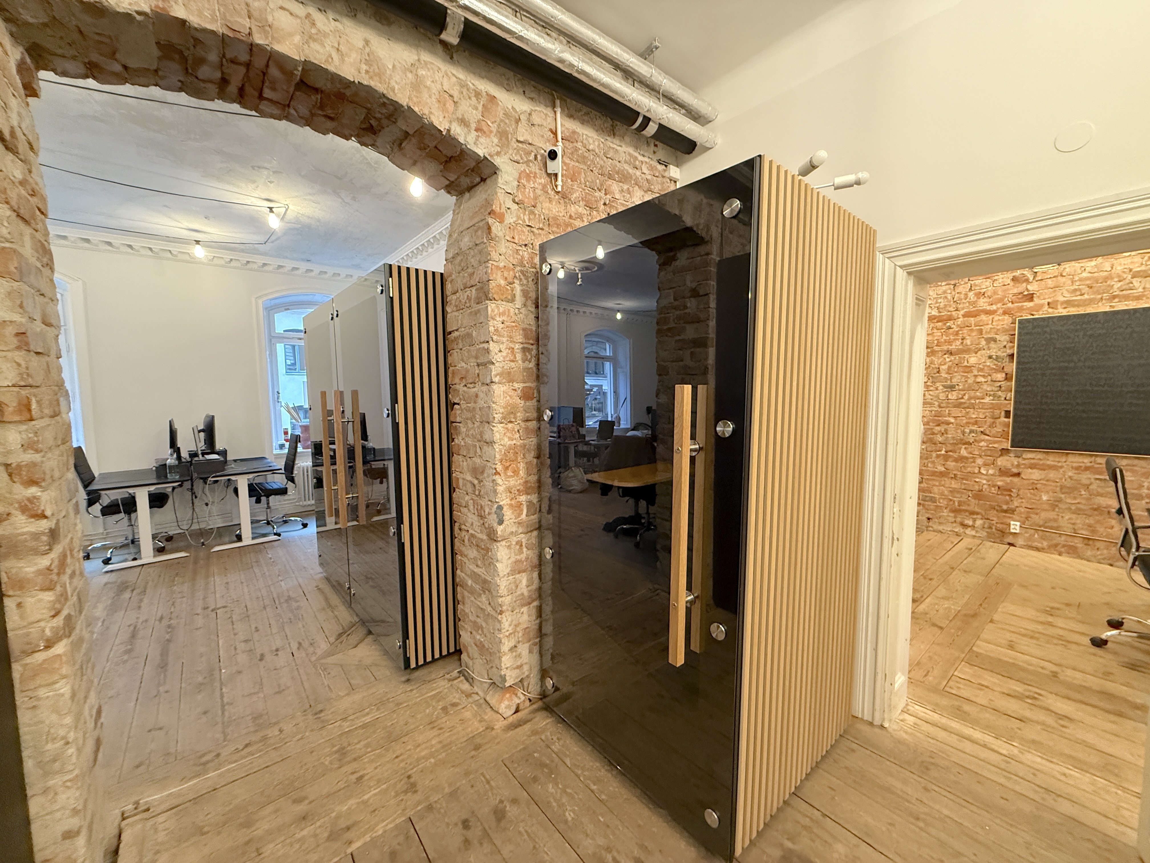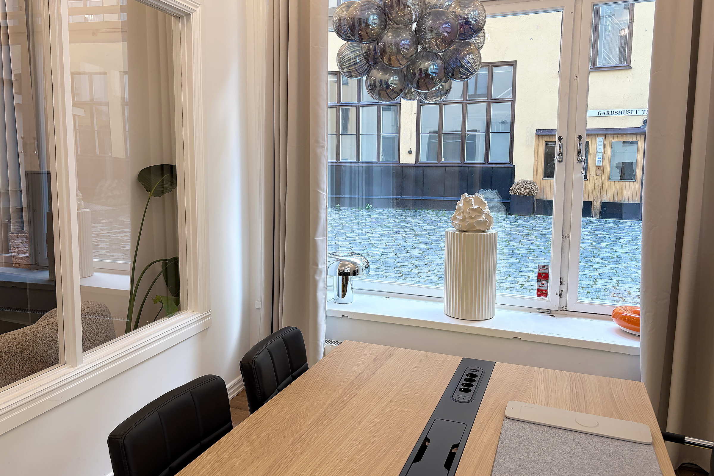 Lokalen har en rustik och karaktärsfull atmosfär med frilagda tegelväggar, trägolv med fin patina och en imponerande takhöjd som skapar rymd. Ytan är uppdelad i två delar, där den ena vetter mot en lugn innergård och den andra mot Tegnérgatans livfulla gatumiljö. Generöst ljusinsläpp från flera väderstreck bidrar till en behaglig arbetsmiljö.