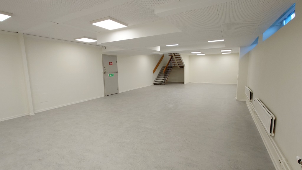 Nedre plan består av en stor öppen yta som kan användas för kontor, butik eller som lättare lager. Här finns också en direktentré till garage, vilket underlättar vid in- och urlastning.