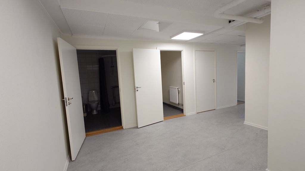 Övre plan erbjuder två kontorsrum, en öppen yta som lämpar sig för kontorslandskap eller butiksyta, ett pentry samt två WC, varav en med dusch.