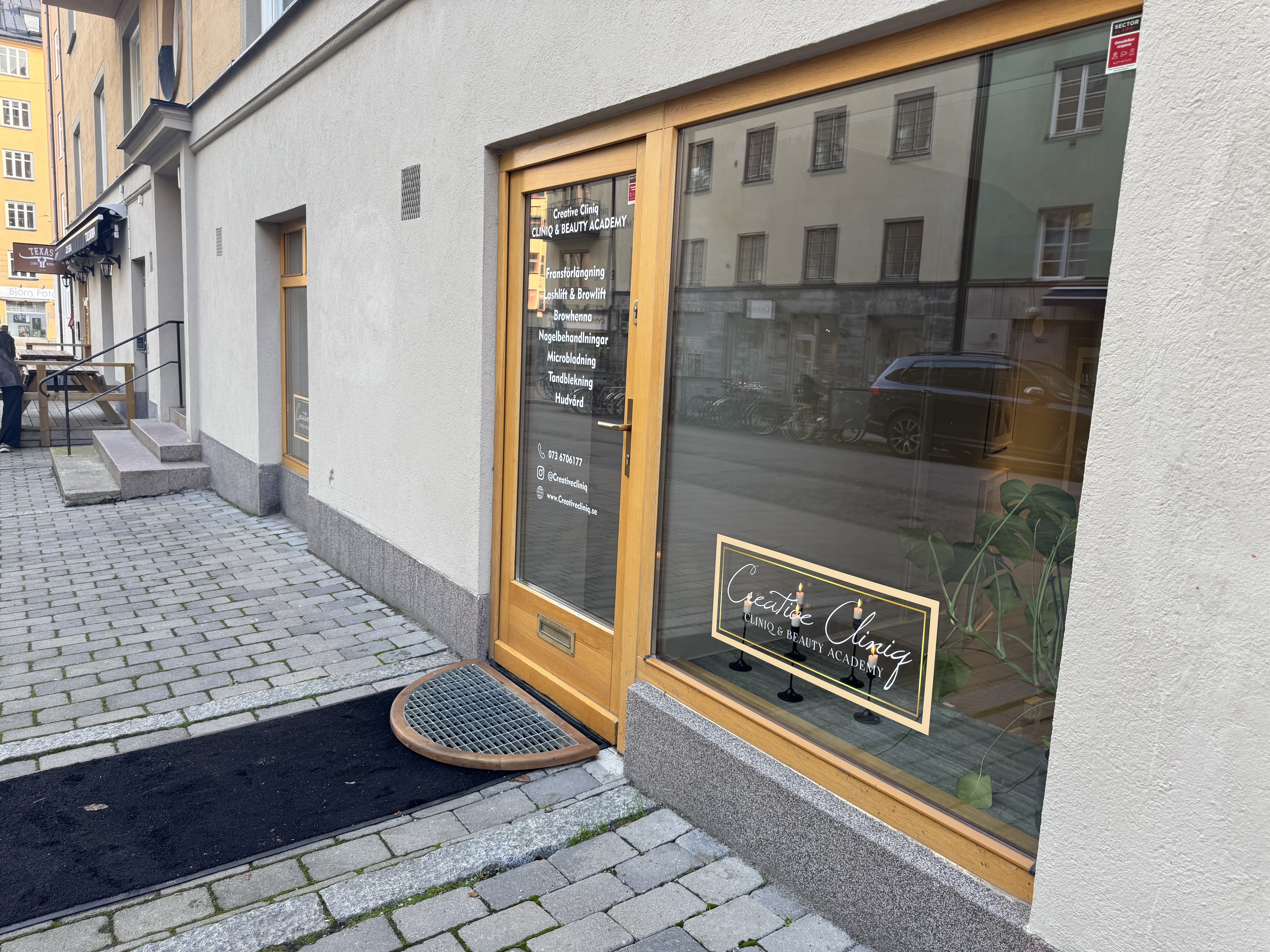 Lokalen nås via en egen ingång direkt från gatan, där en ljus och öppen yta möter upp. Här finns ett trevligt ljusinsläpp från de vackra skyltfönstren som vetter ut mot gatan. Dessa erbjuder också mycket goda möjligheter till exponering. På denna yta finns två separata rum, ett större och ett mindre. Det större rummet har ett stort skyltfönster ut mot gatan. Här finns även en liten W/C.