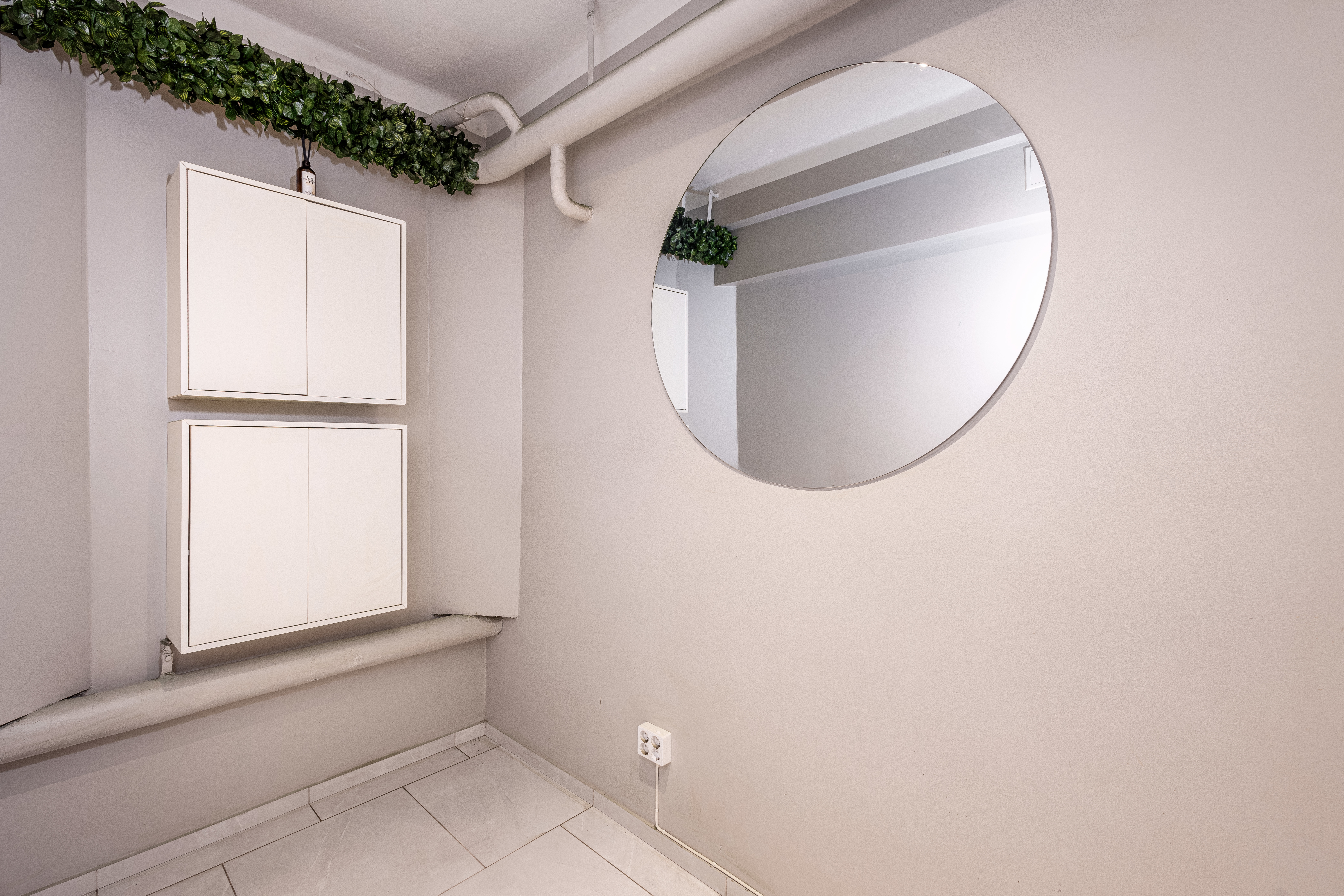 Vidare in i lokalen finner vi ett stort och rymligt bakre utrymme med vackert trägolv och fina vitputsade väggar. Här finns dessutom ett pentry och ett mindre rum förberett för dusch och/eller W/C. På denna yta finns även en direktentré med direkt tillgång till fastighetens vackra innergård!